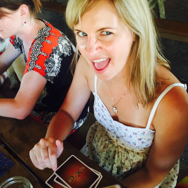 A sexy young blonde sits at a table with a stack of cards.