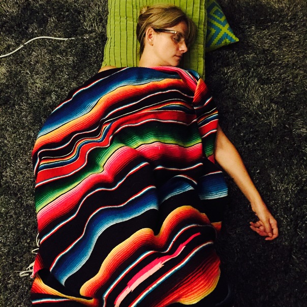 Cozy babe with glasses sleeps in colored poncho blanket on shaggy carpet.