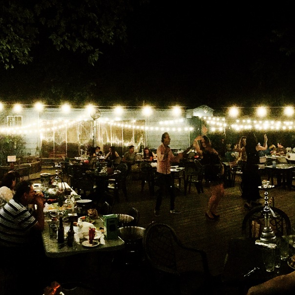 A night time celebration with a man singing and woman dancing around dining people