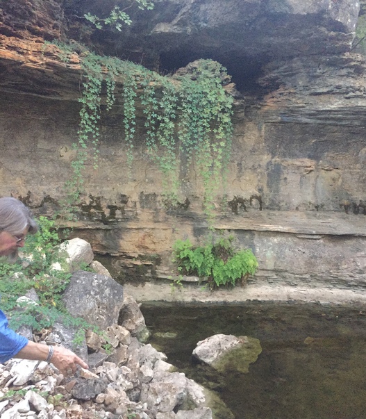 This is a picture of a mountain or rock and a lady feeding fish in the pond.