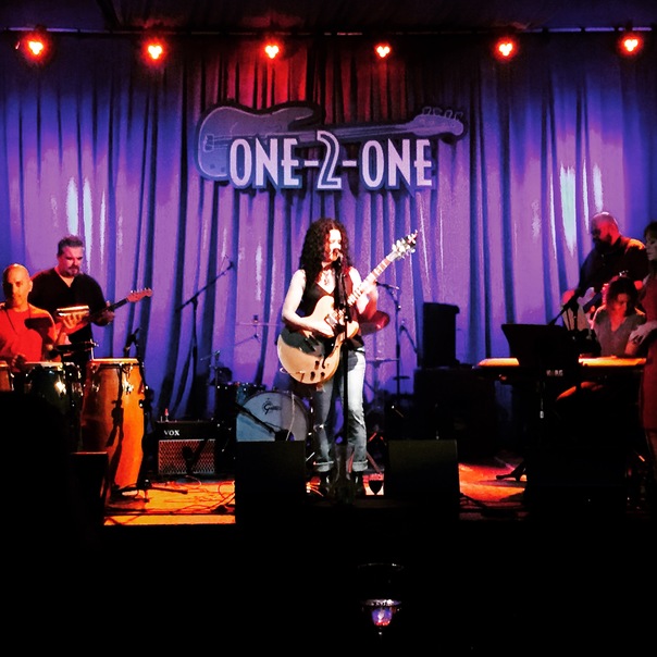 A band is on stage in front of a purple curtain that has a logo which says "One-2-One" on it.