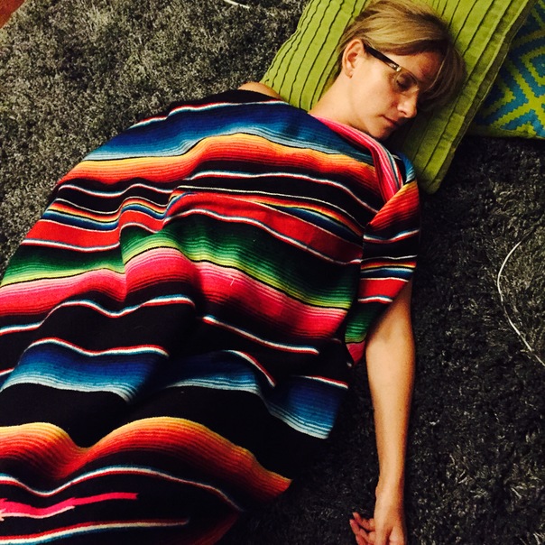 A blonde asleep on the ground under a colorful blanket and a green pillow.