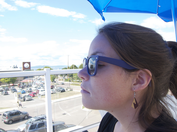 A brown haired girl wearing blue sunglasses and geometric sunglasses is looking out on a sporting event.