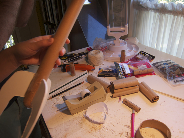 In this picture someone is building a model rocket using a variety of crafting supplies.