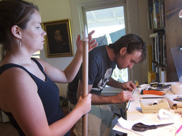 The man and the woman are working on a project together and appear to be seriously occupied with what they are doing.