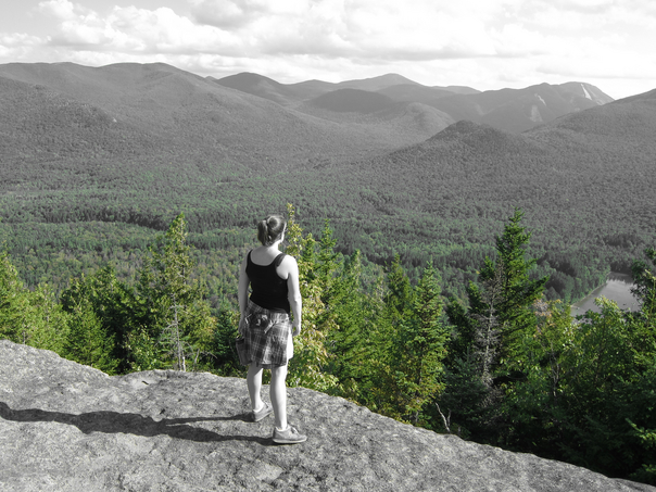 The pony-tailed woman with a plaid shirt tied around her waist surveys the vast, forested mountains.