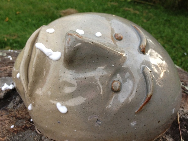 This is a shiny, stone sculpture of a face with droplets of white cream on it.