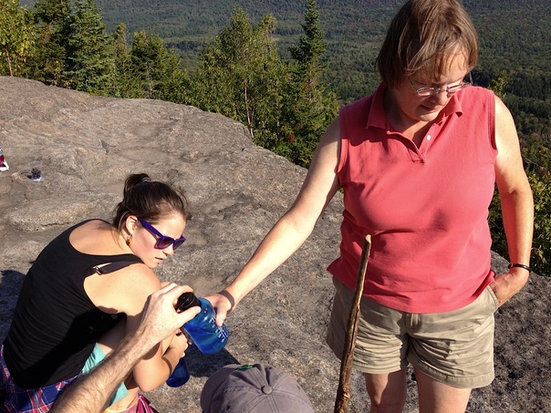 An older woman hands a man a waterbottle as they rest during a hike on a mountain.