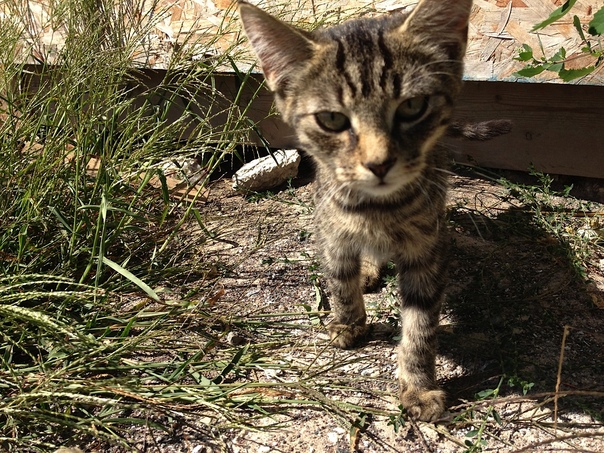 A multicolor small kitten standing beside some grass looking at the camera,