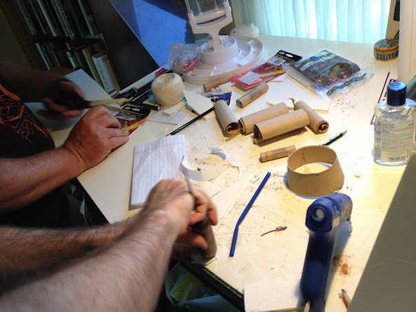 A very messy desk with people's arms working on some type of project using paper and a glue gun.