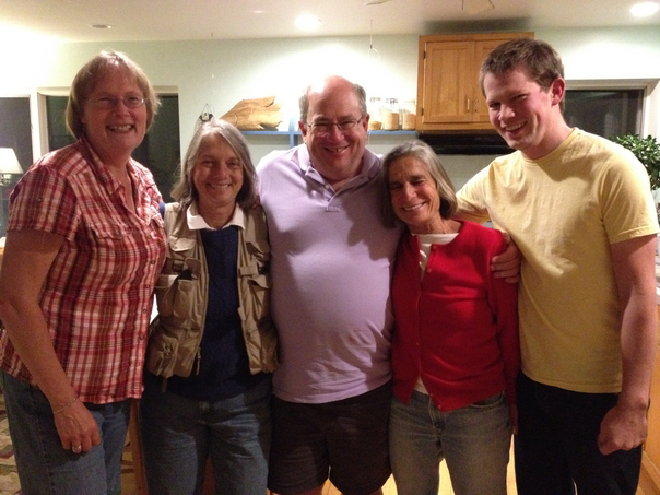 Three older women, one older male, and one younger male stand together with big smiles on their faces for a family photograph.
