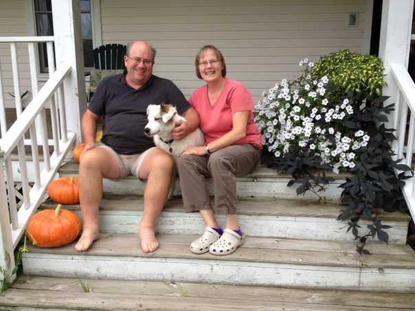A man and woman wearing glasses sit on wooden stairs next to pumpkins and flowers while hugging a dog.