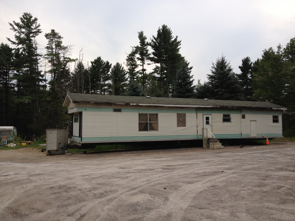 An eggshell colored trailer home sits on a gravel lot in front of a dark green forest.