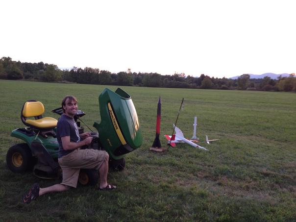 A man is kneeling beside a John Deere lawn mower, and several model rockets are visible in the grass just behind him.