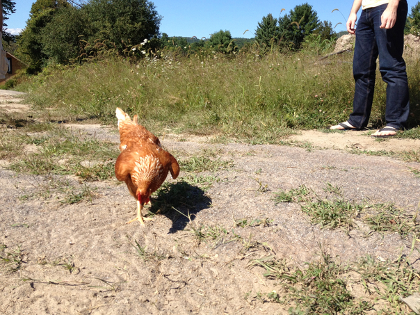 A man watches while a chicken pecks at food on the ground.