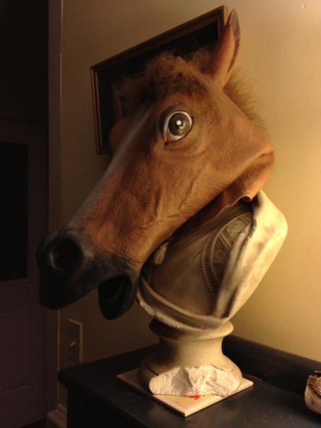 A creepy costume of a horse head rests upon and unknown bust that also has unsightly chunks of marble missing.