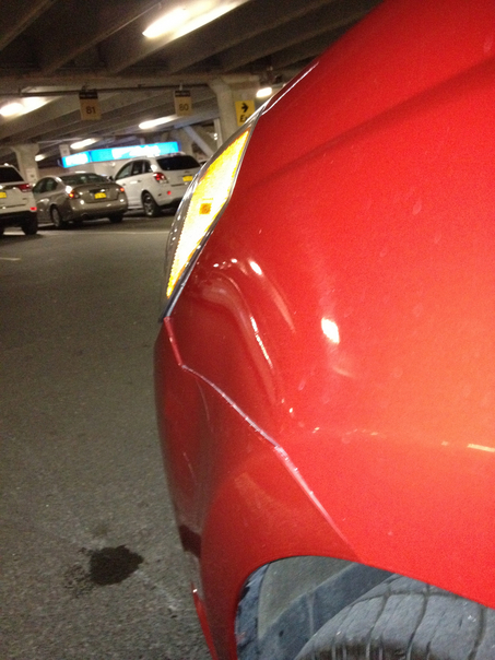 an unsightly oil stain is on the ground in front of a red vehicle with the bright headlight showing.