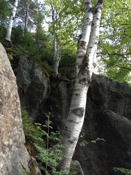 This forest picture depicts birch trees growing around and on a cliff face.