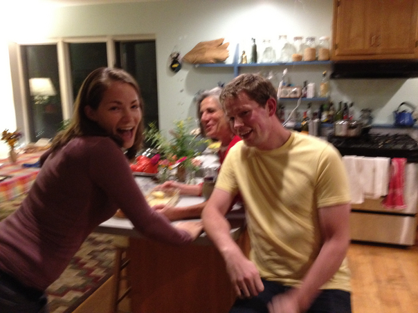Three people sit in a kitchen laughing and smiling while they enjoy food and wine.