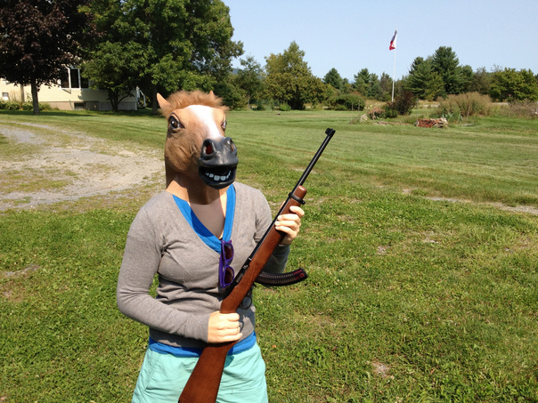 A picture of a girl with a horsehead mssk on carrying a semi-automatic gun.