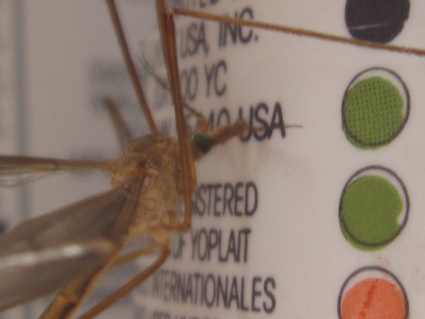 I opened the refrigerator one afternoon only to have a mosquito hawk fly into it and start sucking the perspiration off the side of a yogurt cup. I was going to remove him, but thought it would be more fun to get some close up pictures of him first.