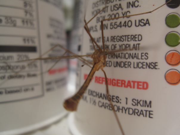I opened the refrigerator one afternoon only to have a mosquito hawk fly into it and start sucking the perspiration off the side of a yogurt cup. I was going to remove him, but thought it would be more fun to get some close up pictures of him first.