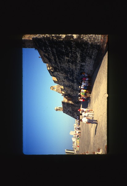The tourists are milling about in the bright sunshine beside the very weathered and historic stone wall |