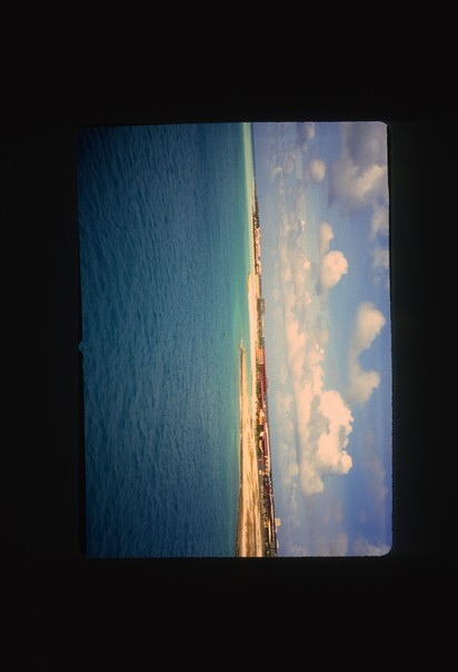 View of a sea and shore where big buildings are present at shore. |