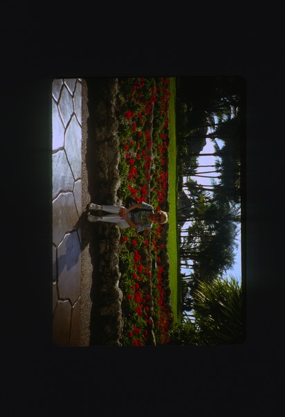 An old women is sitting in the beautiful garden which is covered with so many plantation, flowers, and variety of trees |