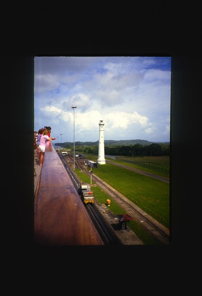 Some people watching the lighthouse view from the top. Transports like lorries are also pass the way. |