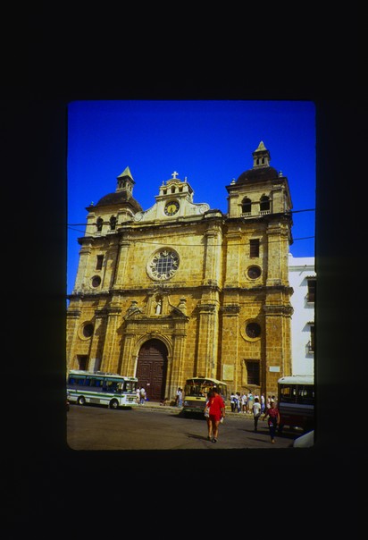 A person in a bright red top poses in the middle of a street that runs in front of a yellow church. |