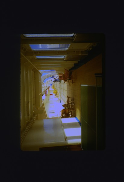 With a ping pong table in the foreground, the view is down the deck of a large ship where there area bunch of deck chairs. |