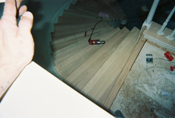 Looking down from the top of a wooden spiral staircase, we can see a drill lying on the steps.