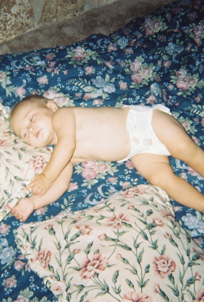 This baby is wearing a diaper and lying on top of a blue quilt with a flowered pattern.