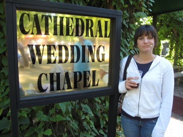 There is nothing that says "wedded bliss" quite like a couple standing in front of a wedding chapel chain smoking and tossing back a few alcoholic drinks.