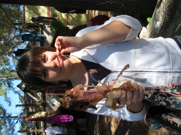 This picture displays a female in her early to late twenties polishing off a disgusting turkey leg.