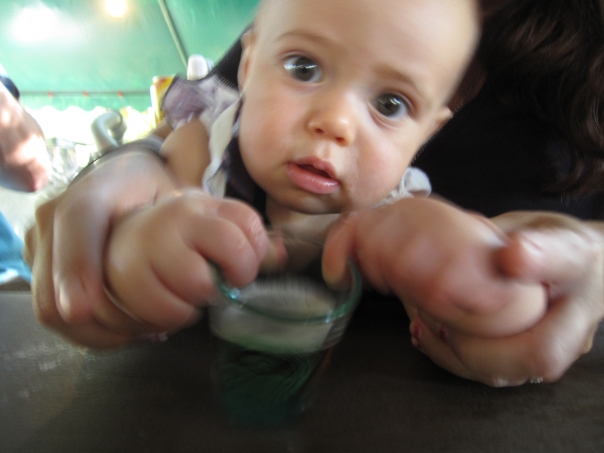 The baby is a little girl and is holding a cup of liquid in her hands.