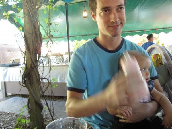 Here is a bemused looking young man in a blue shirt with dark blue edging shaking a bottle for his young daughter while she looks off at something which has caught her attention.