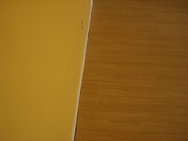 Wood flooring is lying unevenly near white trim at the base of a wall.