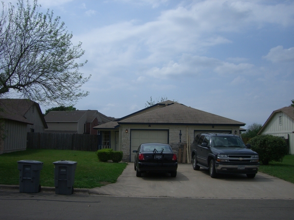 a partly cloudy sky, rows of houses,and two cars parked at a home.