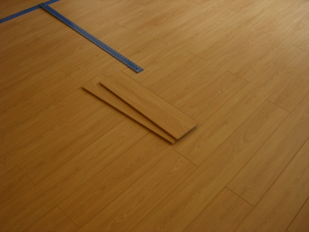 A measuring tool lies on the floor next to planks of cheap wood laminate.