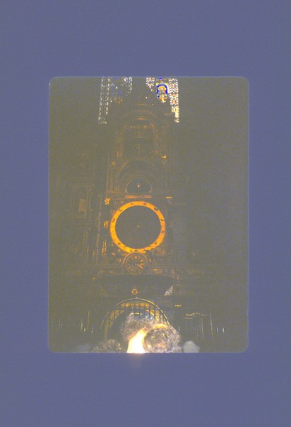 The cathedral was dark inside but the stained glass reflected some outside light. |