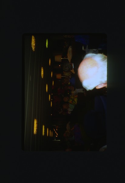 There is a restaurant in the background and in the foreground there is the back of an old man's head. |