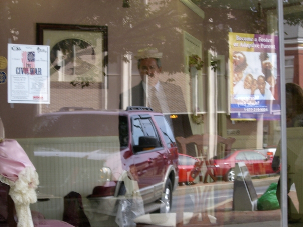 Reflections of a person and cars in a window of a store.