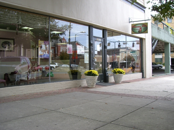 Yellow flowers in huge pots decorate the front door of a downtown business.