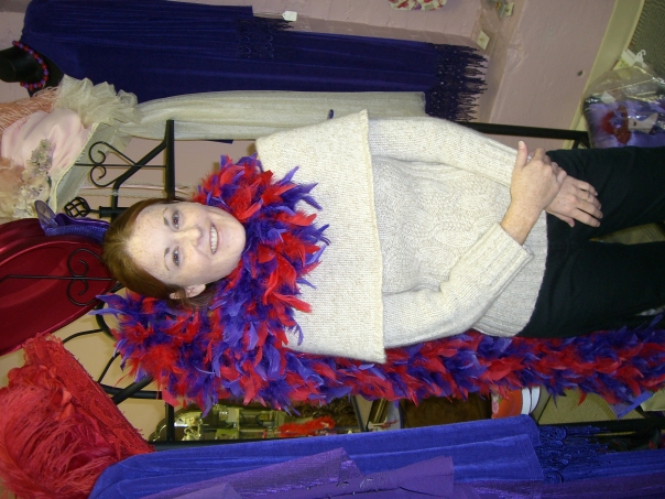 A girl in a white sweater earing a blue and red feathered boa around her neck.