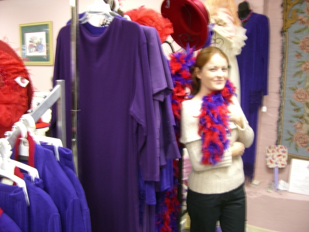 A woman wearing a white sweater and black pants, adorned with a purple and red feather boa, poses next to a dress rack full of purple and red clothing.
