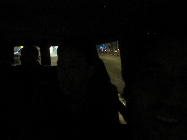 This is a very dark picture from inside of a car, and through the windows you can see what looks like a parking garage.