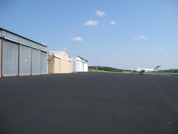 On the left side of the picture, there are three different buildings. They are one-story buildings with aluminum siding and are situated side by side to one another. In front of the buildings, there is a wide area of pavement and in one secion of the pavement sits a small airplane. It is in the distace so cannot see too much detail. Above the buildings is a pretty blue sky with few clouds in it.