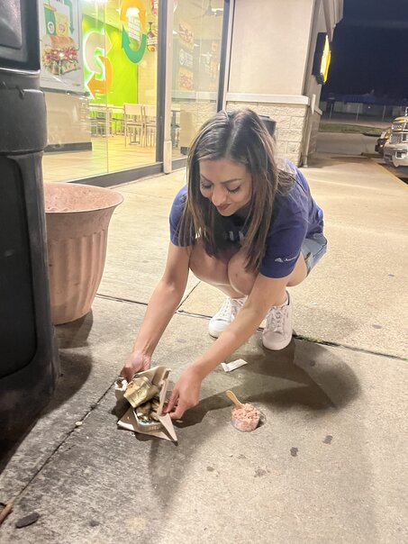 About halfway through the trip and somewhere in Louisiana, we stopped for some gas and caffeine and Rachel came upon a stray cat that was dumpster diving. Always the lover of felines, she grabbed some canned tuna for said cat and we spent a short while making sure it had a meal.